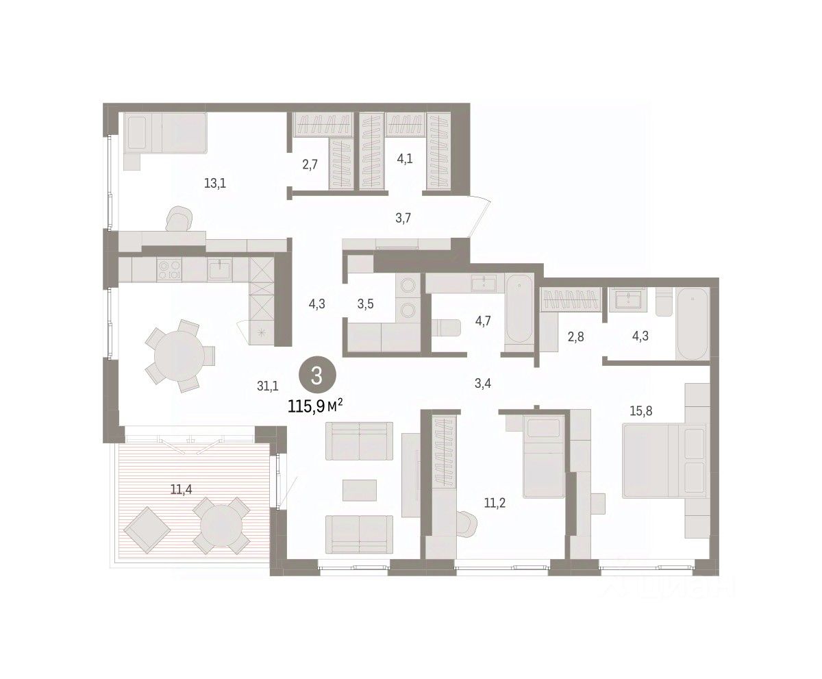 3-комн. квартира от застройщика с предчистовой отделкой в ЖК "Квартал "Юность"" на 15 этаже. Общая площадь: 115.91 кв.м. Высота потолков 2.7 м.