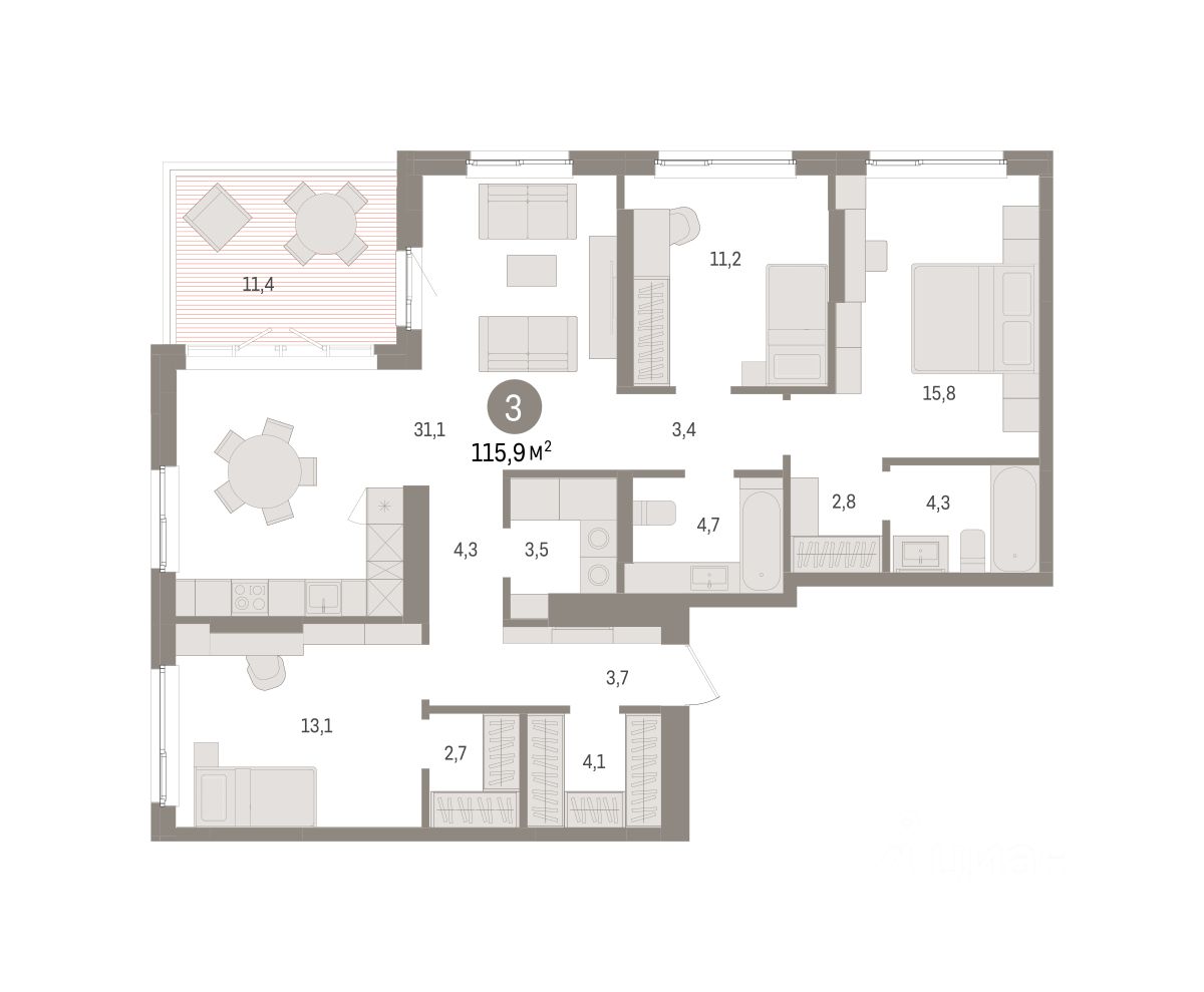 3-комн. квартира от застройщика с предчистовой отделкой в ЖК "Квартал "Юность"" на 15 этаже. Общая площадь: 115.9 кв.м. Высота потолков 2.7 м.