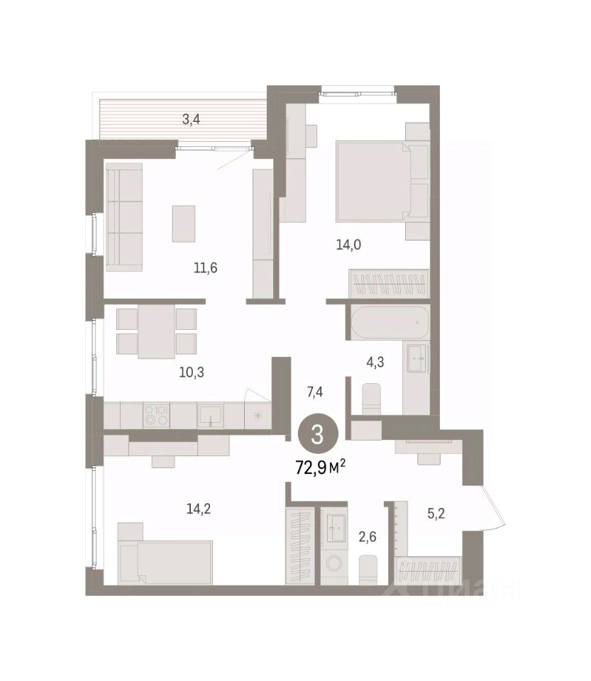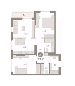 3-комн. квартира с предчистовой отделкой в ЖК "Квартал "Юность"" на 13 этаже. Общая площадь: 72.94 кв.м., жилая: 39.8 кв.м., площадь просторной кухни-гостиной: 10.3 кв.м. Угловая квартира, идеально подойдет любителям тишины и панорамных видов. В квартире одна лоджия, один совмещенный и один раздельный санузел. Высота потолков 2.7 м.
