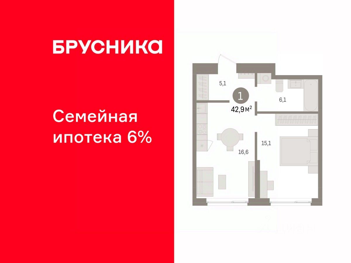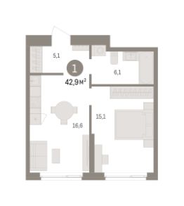 Однокомнатная квартира с предчистовой отделкой в ЖК "Квартал "Юность"" на 2 этаже. Общая площадь: 42.85 кв.м. Высота потолков 2.7 м.