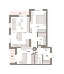 Двухкомнатная квартира с предчистовой отделкой в ЖК "Квартал "Юность"" на 5 этаже. Общая площадь: 72.16 кв.м., жилая: 24.3 кв.м., площадь просторной кухни-гостиной: 22.3 кв.м. Квартира угловая, очень светлая, естественная вентиляция при открытии окон. В квартире две лоджии, один совмещенный и один раздельный санузел. Высота потолков 2.7 м.