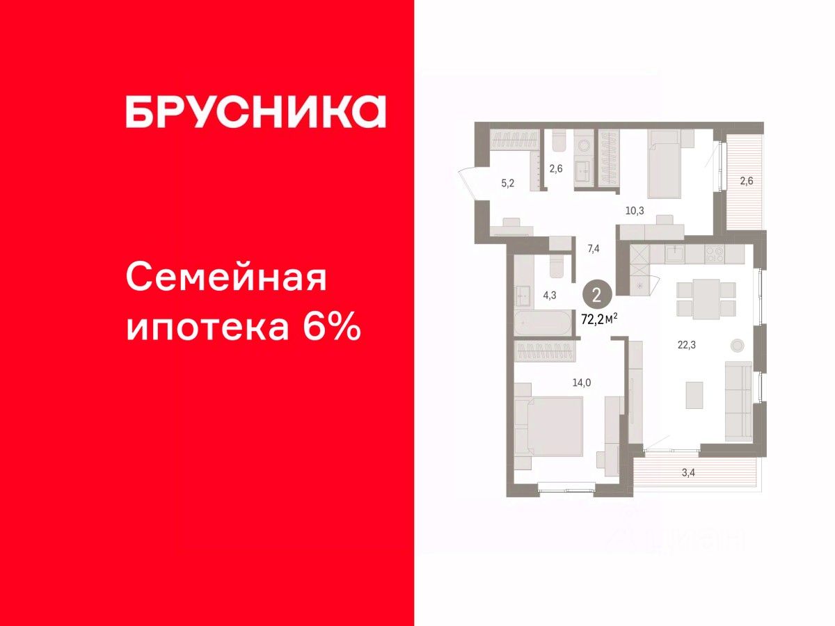 Квартира с кухней-гостиной и двумя спальнями в квартале "Юность". Особенности планировки: вид во двор, второй санузел, лоджия, разнесённые спальни.