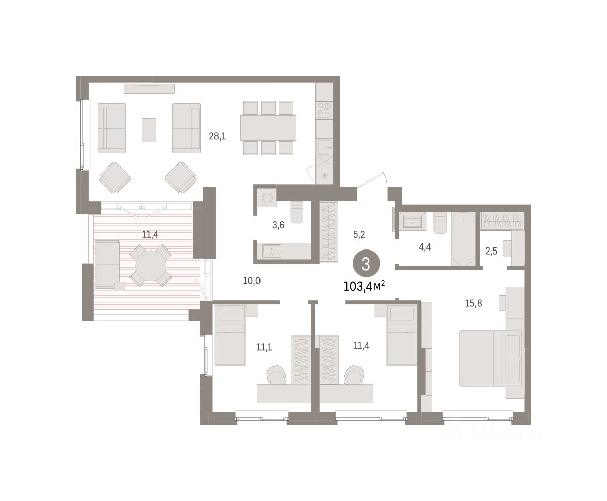 Квартира с кухней-гостиной и тремя спальнями в квартале "Юность". Особенности планировки: вид во двор, второй санузел, гардеробная, разнесённые спальни, терраса на крыше.