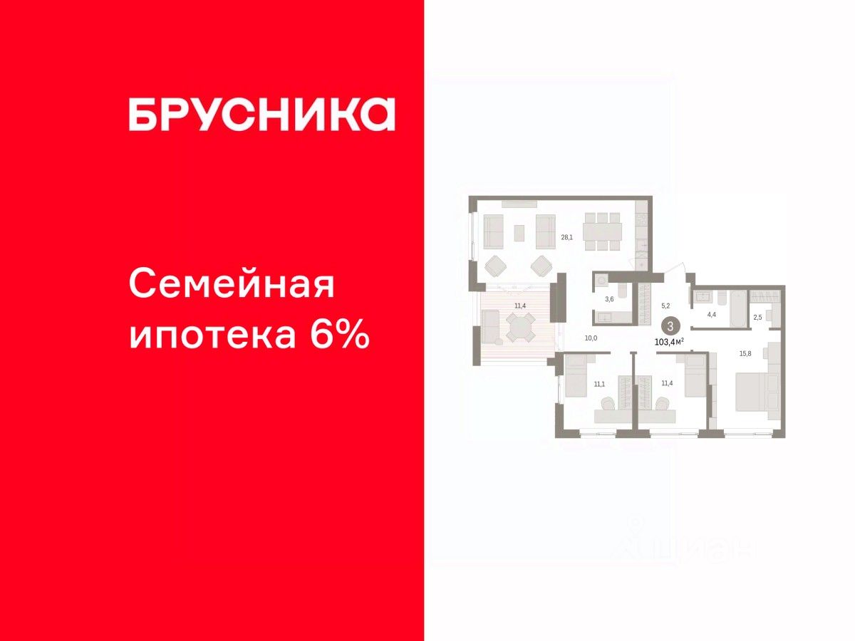 Просторная 3-комн. квартира с предчистовой отделкой в ЖК "Квартал "Юность"" на 16 этаже. Общая площадь: 103.38 кв.м. Высота потолков 2.7 м.