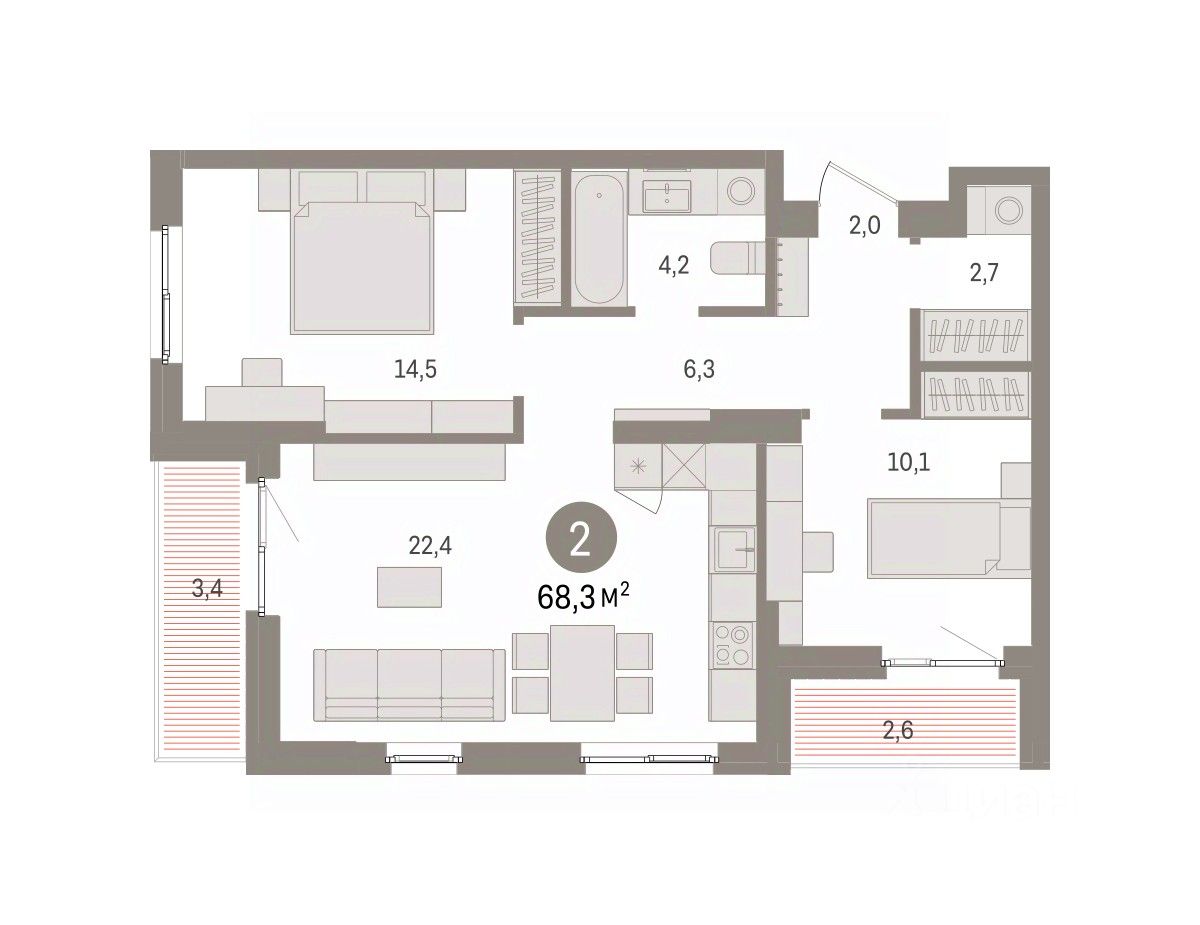 Квартира с кухней-гостиной и двумя спальнями в квартале "Юность". Особенности планировки: балкон, постирочная, разнесённые спальни.