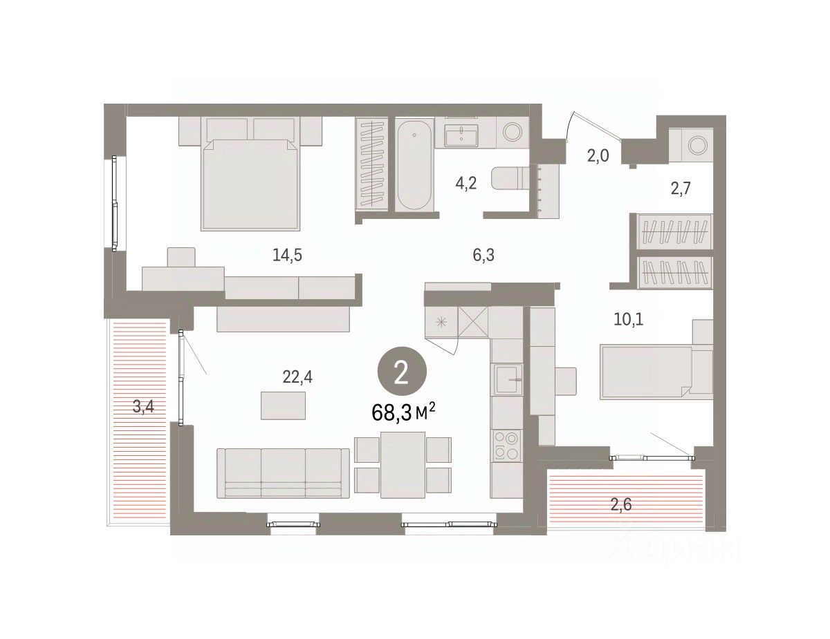 Двухкомнатная квартира с предчистовой отделкой в ЖК "Квартал "Юность"" на 3 этаже. Общая площадь: 68.26 кв.м., жилая: 24.6 кв.м., площадь просторной кухни-гостиной: 22.4 кв.м. Квартира угловая, очень светлая, естественная вентиляция при открытии окон. В квартире две лоджии, один совмещенный санузел. Высота потолков 2.7 м.