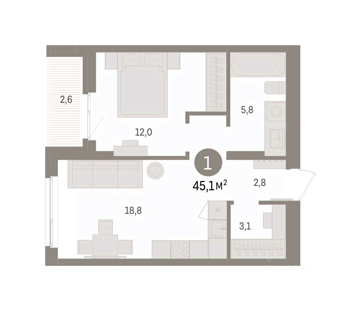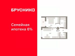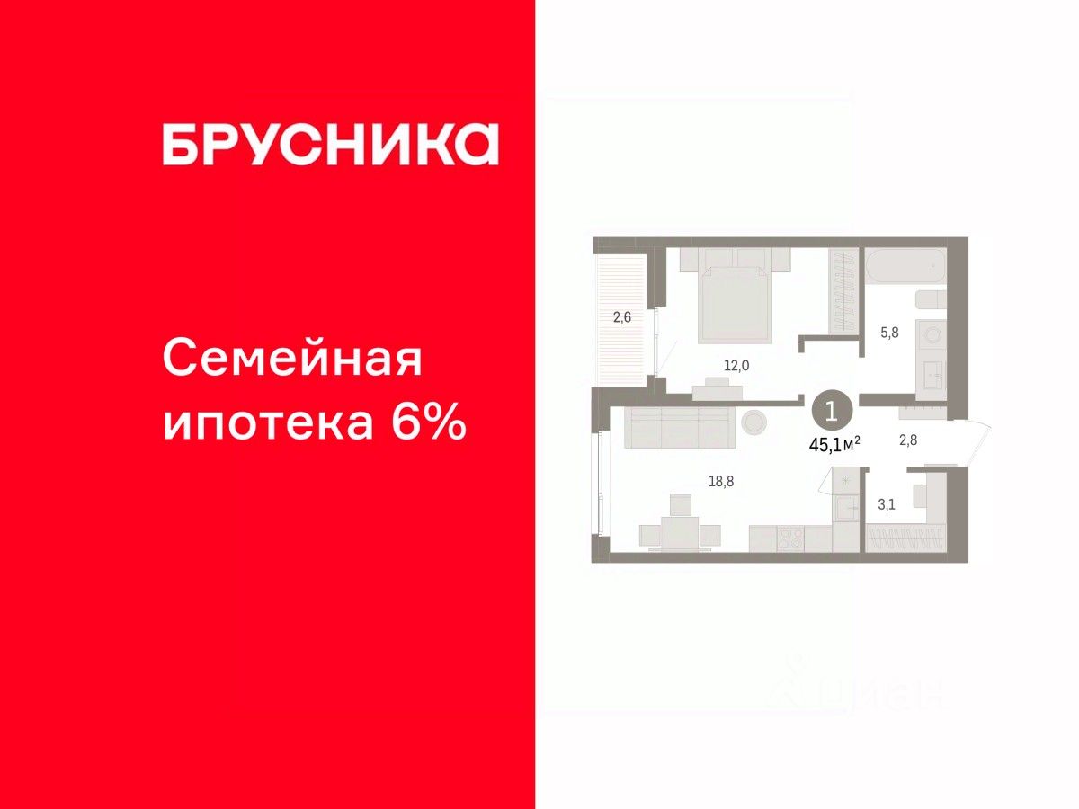 Однокомнатная квартира от застройщика с предчистовой отделкой в ЖК "Квартал "Юность"" на 4 этаже. Общая площадь: 45.06 кв.м. Высота потолков 2.7 м.