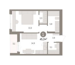 Просторная 1-комн. квартира с предчистовой отделкой в ЖК "Квартал "Юность"" на 5 этаже. Общая площадь: 45.28 кв.м., жилая: 13.3 кв.м., площадь просторной кухни-гостиной: 14.9 кв.м. Все окна выходят на одну сторону. В квартире одна лоджия, один совмещенный санузел. Высота потолков 2.7 м.