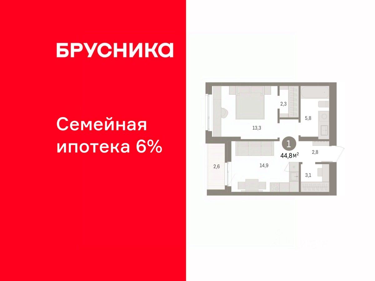 1-комн. квартира с предчистовой отделкой в ЖК "Квартал "Юность"" на 7 этаже. Общая площадь: 44.8 кв.м., жилая: 13.3 кв.м., площадь просторной кухни-гостиной: 14.9 кв.м. Все окна выходят на одну сторону. В квартире одна лоджия, один совмещенный санузел. Высота потолков 2.7 м.