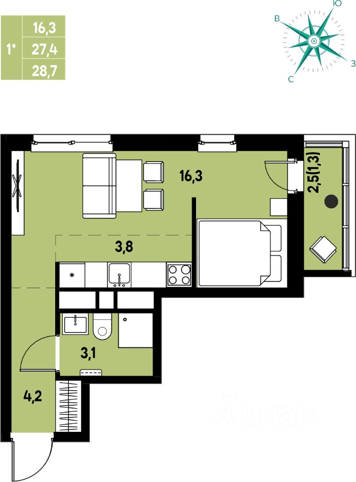 28,7 м²