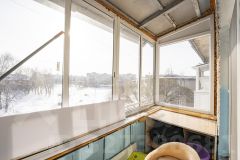 Балкон просторный и вместительный с полками для хранения вещей, застеклен пластиковыми окнами.
