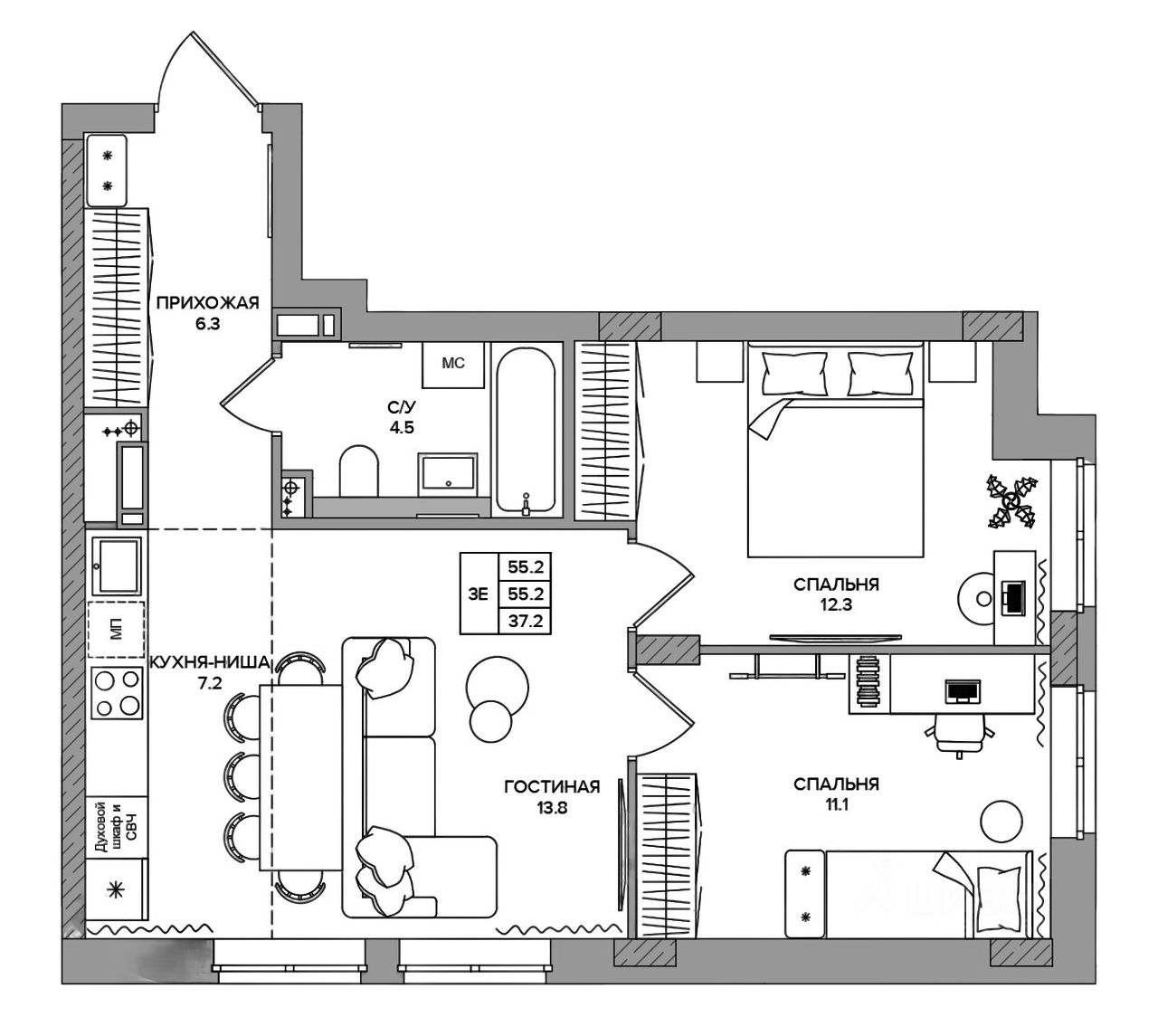 Общая площадь55,2 м²