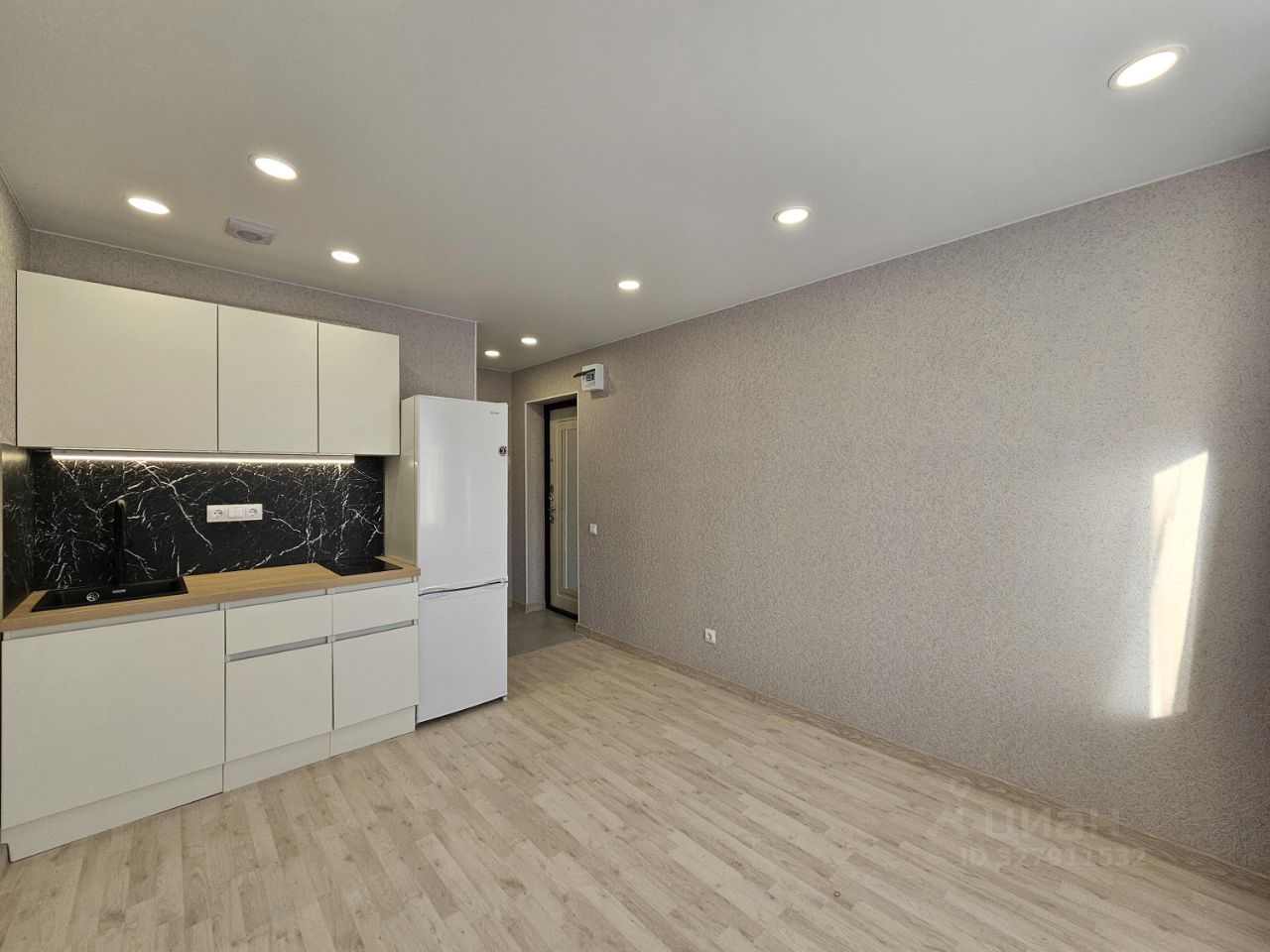 Выделена кухонная зона, куда установлен новый, встроенный кухонный гарнитур с варочной поверхностью и подсветкой, а справа от него оборудовано место под холодильник и сам холодильник.