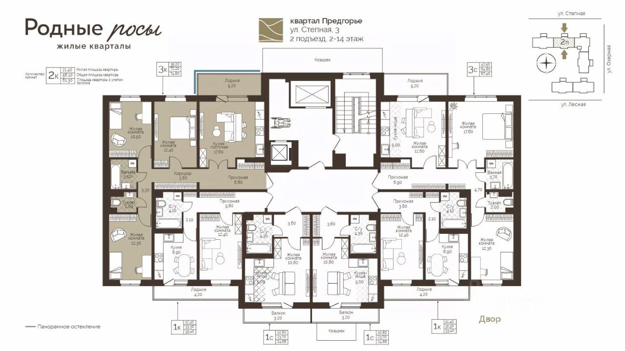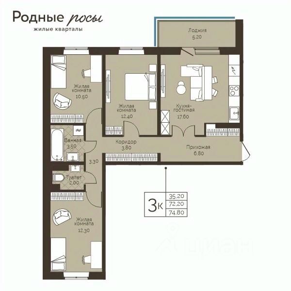 Продаётся 3-комнатная квартира в строящемся доме (Степная, 3), срок сдачи: III-кв. 2028, общей площадью 74.8 кв.м., на 12 этаже. Новый жилой комплекс "Родные росы" от Специализированного застройщика "Финпроект" расположен в с. Фролы по ул. Академическая.