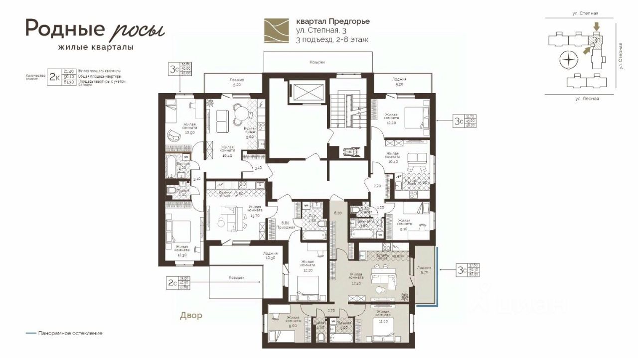 Продаётся 3-комнатная квартира в строящемся доме (Степная, 3), срок сдачи: III-кв. 2028, общей площадью 58.9 кв.м., на 5 этаже. Новый жилой комплекс "Родные росы" от Специализированного застройщика "Финпроект" расположен в с. Фролы по ул. Академическая.