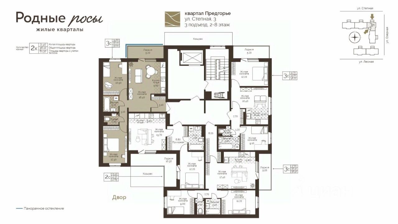 Продаётся 3-комнатная квартира в строящемся доме (Степная, 3), срок сдачи: III-кв. 2028, общей площадью 58.6 кв.м., на 6 этаже. Новый жилой комплекс "Родные росы" от Специализированного застройщика "Финпроект" расположен в с. Фролы по ул. Академическая.
