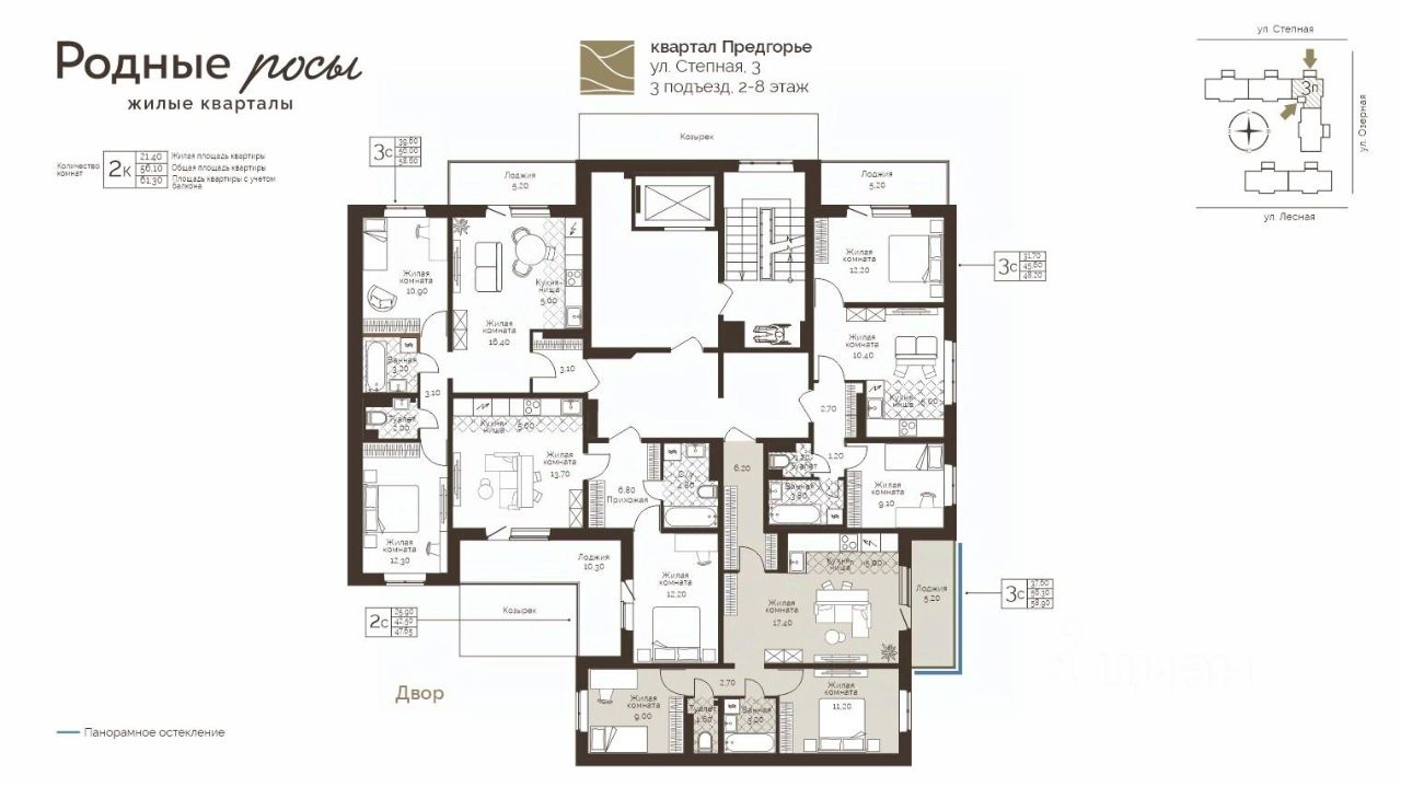 Продаётся 3-комнатная квартира в строящемся доме (Степная, 3), срок сдачи: III-кв. 2028, общей площадью 58.9 кв.м., на 8 этаже. Новый жилой комплекс "Родные росы" от Специализированного застройщика "Финпроект" расположен в с. Фролы по ул. Академическая.