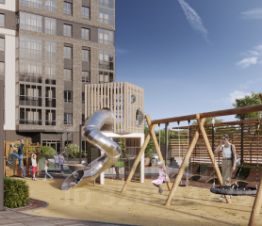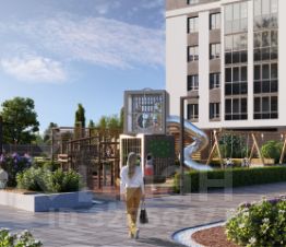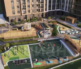 Благоустройство придомовой территории. LOQO экологичный центр для жизни и отдыха. На придомовой территории дома реализована концепция двор-сада без машин и посторонних. Внимание детей привлекут качели-тарзанки с резиновым покрытием, а также горка на холме с геопластикой, которая делает катание детей с горки максимально безопасным, поскольку резиновая крошка смягчает любые падения. Пока дети катаются с горки-трубы, родители могут удобно расположиться на шезлонгах, размещенных под навесом. Видеокамеры с возможностью подключиться к ним дистанционно, огороженная территория и умный шлагбаум обеспечат безопасный отдых вам и вашим близким.