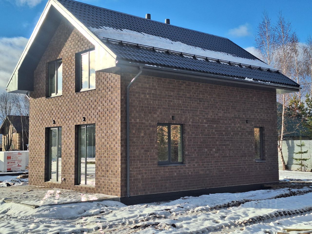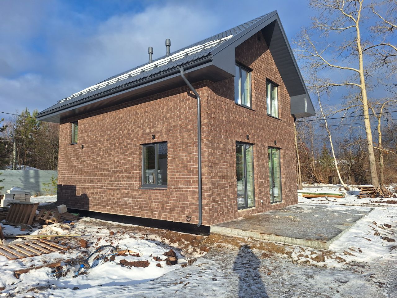 - Кровля-металлочерепица 0,5 мм. Утепление по кровле 200 мм. Выполнена подшивка свесов, водосточная система, выходы вентиляции Vilpe (Финляндия);