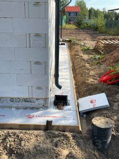 Фундамент - УШП (Утеплённая Шведская Плита) со встроенной системой отопления "тёплый пол". Утеплённая отмостка с дренажной системой, отводящей воду из водосточной системы за пределы участка.