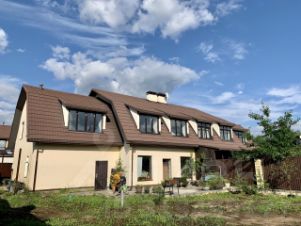 -Кровля- покрытие -композитная черепица, шумостойкая, не требует установки снегозадержателей, не выцветает, долговечна. Не смотря на многослойную структуру материала, сама черепица легкая (до 6,6 кг/м2), при этом композитная кровля выдерживает большие нагрузки (до 500 кг/м2), что актуально, к примеру, в условиях снежной зимы.