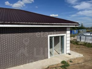 - Наружные стены выполнены из газоблоков толщиной 400 мм, внутри оштукатурены и зашпаклёваны по технологии white box, снаружи облицовка гибким камнем индивидуального дизайна