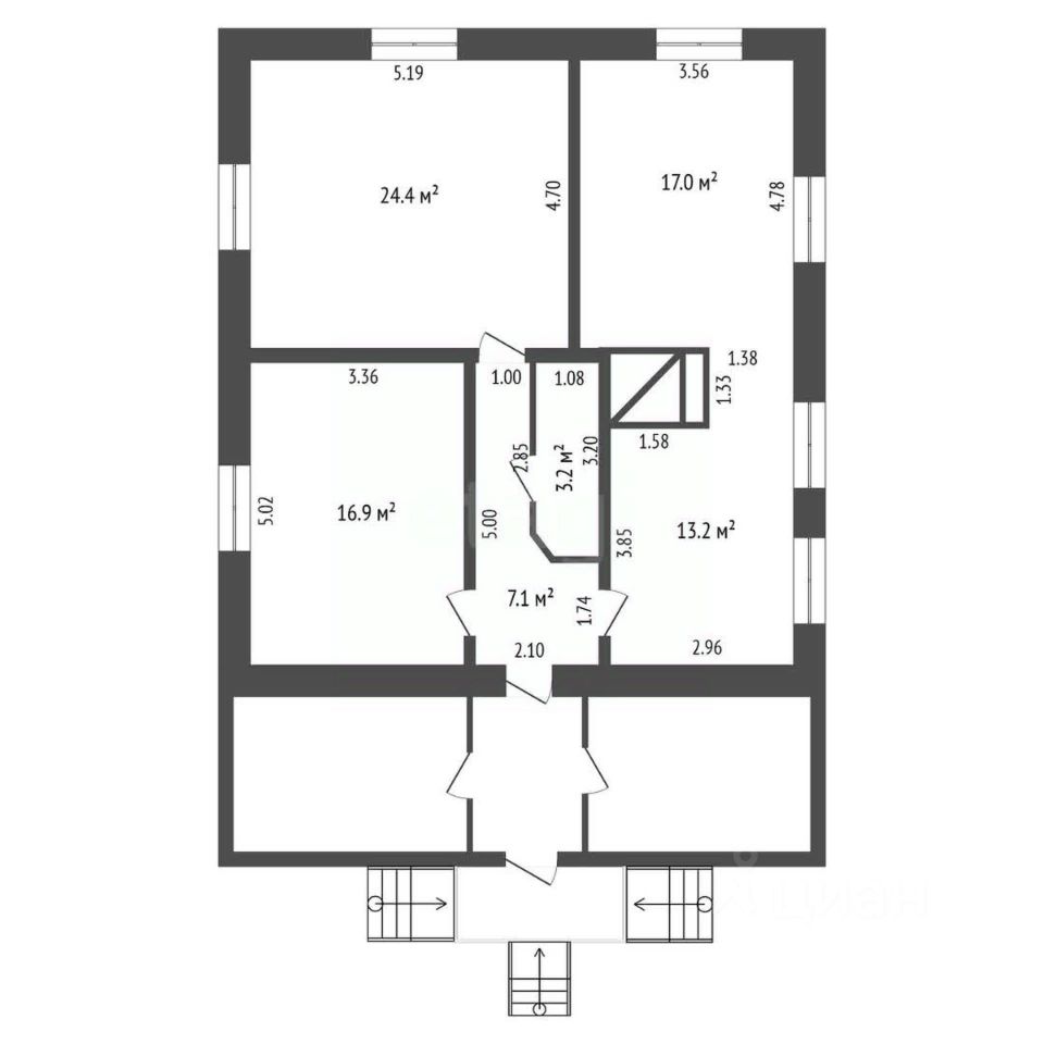 Основное здание площадью 81 кв. м включает три изолированные комнаты и просторную кухню-гостиную, что формирует комфортное жилое пространство для постоянного проживания или сезонного отдыха. К дому примыкают две веранды, выполняющие функцию светлых буферных зон и увеличивающие полезную площадь.