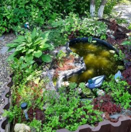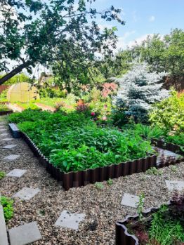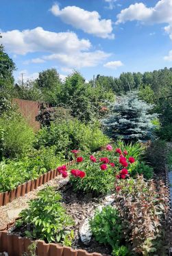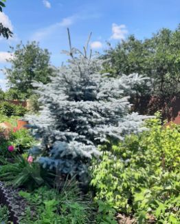 В саду выполнен ландшафтный дизайн. Растёт голубая ель, много плодово - ягодных кустарников, многолетних цветов.