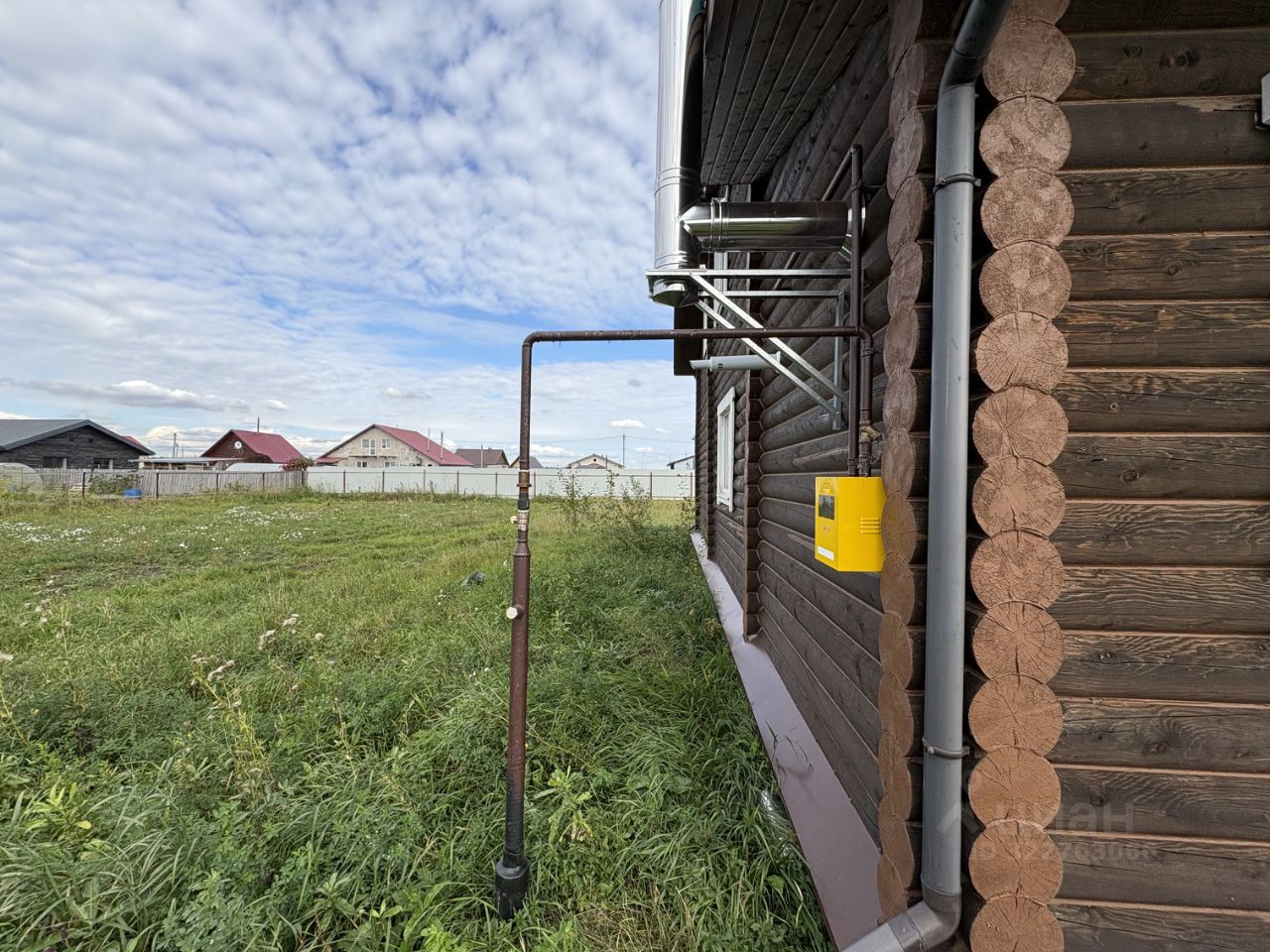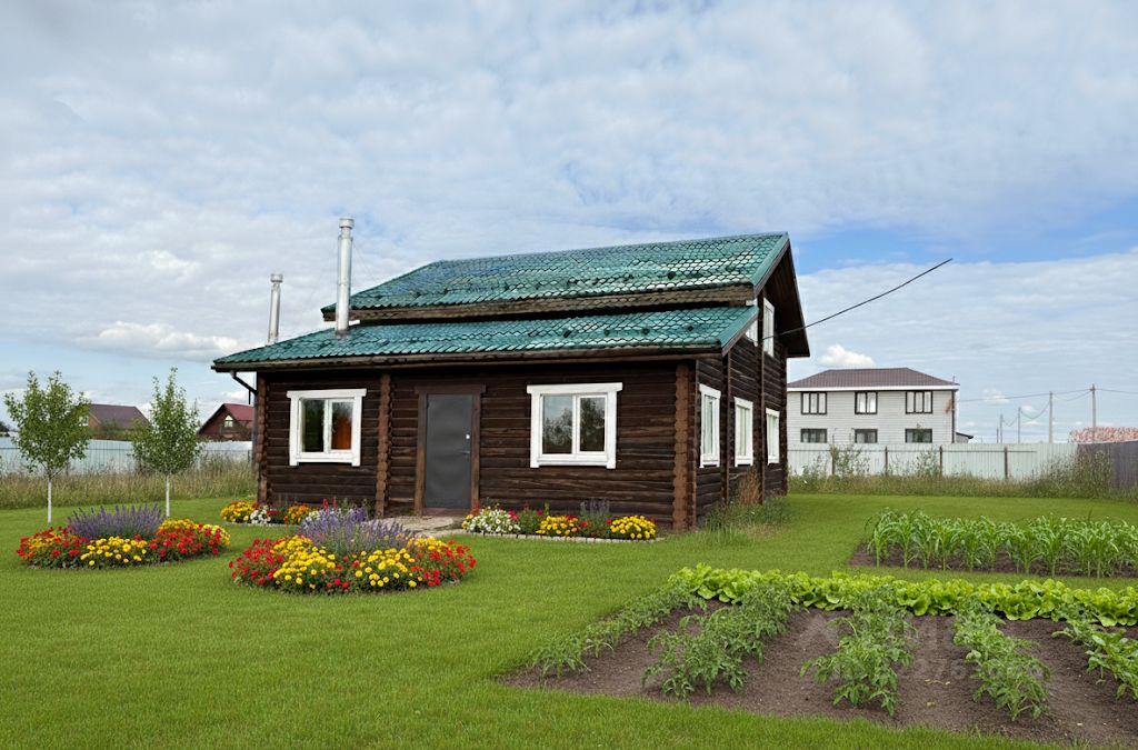 Двухэтажный коттедж из оцилиндрованного бревна, построенный в 2025 году. Сруб тёмного цвета, крыша из зелёной металлочерепицы. Полы первого этажа утеплённые, перекрытия и перегородки шумоизолированы.