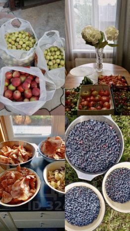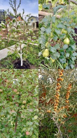 На участке растут: яблони, груши, вишня, смородина, жимолость, облепиха, крыжовник и другие плодово-ягодные культуры.