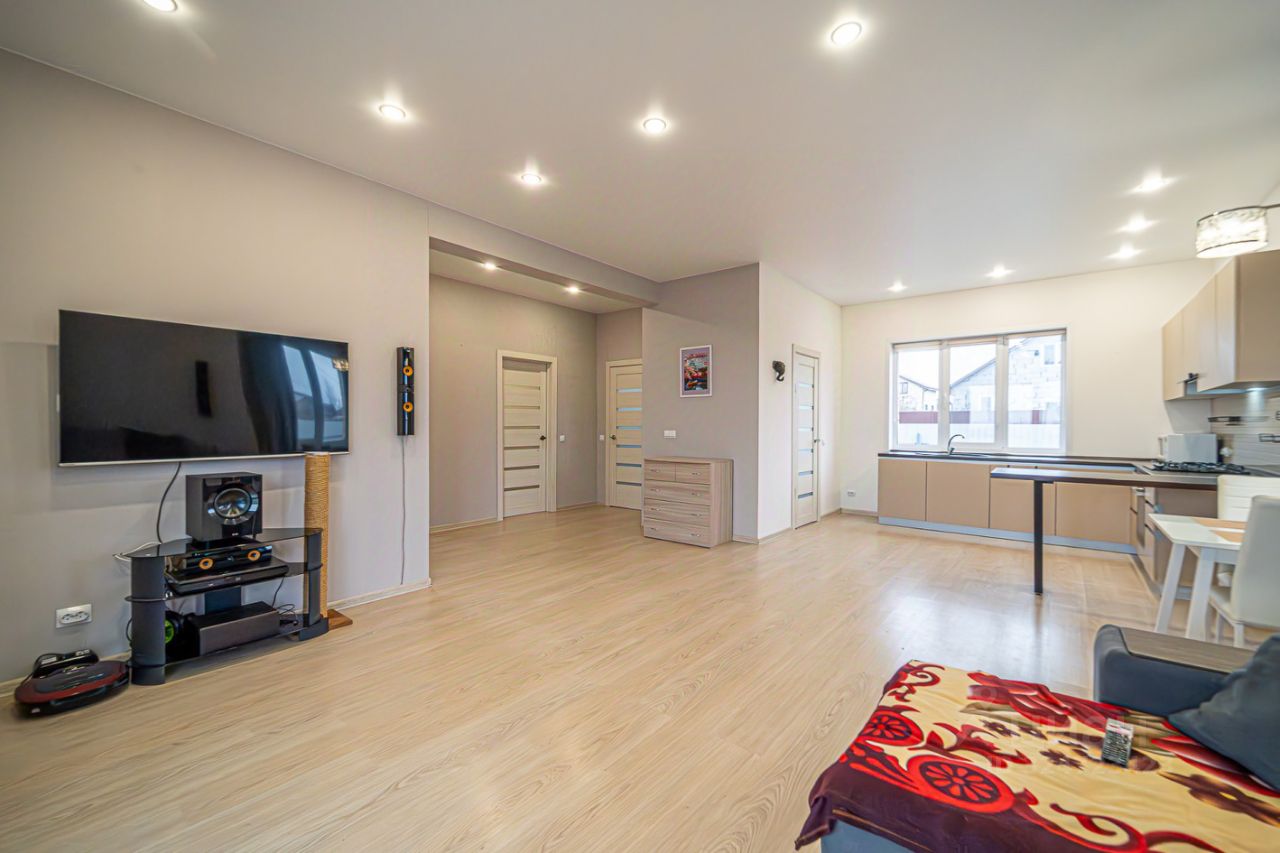 При входе вас встречает просторная прихожая с вместительным шкафомкупе — больше не нужно искать место для вещей всей семьи. А дальше раскрывается главная жемчужина дома: большая кухнягостиная с эркером и панорамным окном. Утром сюда льётся солнечный свет, вечером за стеклом мерцают уютные огни посёлка. Из гостиной — прямой выход на террасу, где так приятно пить кофе на свежем воздухе или устраивать семейные ужины под открытым небом. На первом этаже также есть отдельная комната — идеальный кабинет для тех, кто работает из дома, и удобная кладовая рядом с кухней, незаметная для гостей, но невероятно практичная.