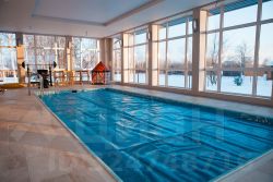 - Бассейн с панорамными окнами, подводной подсветкой, противотоком, системой очистки воды и воздуха в помещении.