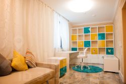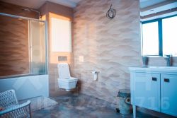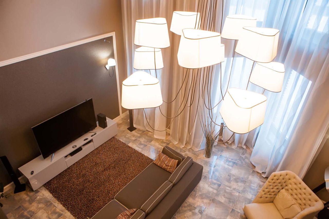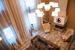 1 этаж: уютная двухуровневая гостиная с дизайнерским камином и просторная кухня-столовая, 2 кабинета, санузел, душевая, сауна со стеной из солевых блоков, гардеробная, бассейн, технические помещения, прачечная.