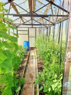 • Площадь дома: 80,6 м², два этажа (второй этаж утеплён) ; • Материал: качественный брус ; • Фундамент: ленточный ; • Окна: пластиковые ; • Веранда: сделана ; • Парковка: забетонированная на участке ; • Теплицы: две на участке (каркас из железа) ; • Крыша: профнастил.
