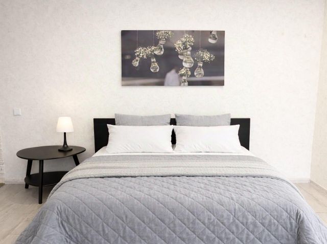 Квартира оснащена всем необходимым для комфортного пребывания. Здесь есть все удобства, необходимые для 1-2 человек: кухонная зона с плитой, холодильником и посудой, уютная спальня с удобной кроватью и конечно же, современная ванная комната.