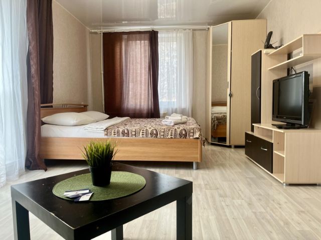 Однокомнатная квартира класса ЛЮКС с застекленным балконом и душевой кабиной, находится в районе Универсам-1. этаж. В шаговой доступности ТРЦ Оранж Молл, ТЦ Миллениум, несколько больших супермаркетов, кафе. Остановки: Газета Звезда, площадь Юбилейная, МЖК. Удобный выезд из города. ___ Апартаменты полностью соответствуют фотографиям. Никаких комиссий и посредников! ___ В квартире легко могут разместиться до 4 человек. Есть все для комфортного и беззаботного проживания: - чистота и порядок - удобная двуспальная кровать шириной 140 см - раскладной диван - отутюженное белое постельное белье и полотенца на каждого гостя - ЖК телевизор 42 дюйма - стиральная машинка - гладильная доска, утюг, фен, сушилка для одежды - полностью оборудованная кухня - посуда и приборы для самостоятельного приготовления и приема пищи - чай, сахар, соль - гигиенические аксессуары - быстрый и стабильный Wi-Fi ___ По запросу, за дополнительную плату предоставляются: - услуги горничной - завтрак в апартаменты - трансфер