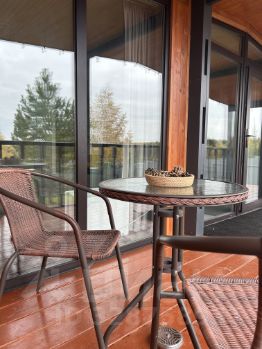 В этом доме больше всего видна река с ее изгибами. В доме много света, а вечером с террасы открывается лучший вид на закаты. Из больших окон открывается прекрасная панорама на местный ландшафт: реки, лес, горы. Дом имеет отдельную комнату с двуспальной кроватью (160*200 см), которая при запросе трансформируется в две односпальные (80*200 см). В общей комнате стоит диван, который раскладывается в двуспальное место. Обеденная зона с большим круглым столом и мягкими стульями. Обустроенная кухня: - Питьевая вода (установлен фильтр), - Индукционная плита на 2 конфорки, - Встраиваемый холодильник Hansa, - Электрический чайник Philips, - Микроволновая печь Tesler, - Посуда (кастрюля, сковорода, тарелки, кружки, набор бокалов, стаканы, столовые приборы, кухонные принадлежности, разделочная доска, металлическая миска, терка), - Заварочный чайник, - Масло, сахар, соль, перец, чай, - Средство для мытья посуды, губка, - Бумажные полотенца. Шкаф для вещей и большое зеркало, плечики и крючки для одежды. Про комфорт. В доме есть: - Горячая вода, водонагреватель на 80 л. - Душ, раковина и унитаз. - Электрический полотенцесушитель, - Косметическое зеркало с подсветкой, - Фен, - Шампунь, гель для душа, жидкое мыло для рук, - Белое постельное белье и набор белых полотенец для каждого гостя. Во всем доме установлены теплые полы и конвектор, который самостоятельно поддерживает комфортную температуру. Около каждого дома установлен мангал с крышкой. Он предоставляется бесплатно. По запросу можно бесплатно взять шампуры и решетку, которые просим помыть после использования. Уголь и розжиг нужно привести с собой. Также есть умная колонка Алиса (скажите, привет "Алиса"). Дополнительные услуги для гостей: - Баня с панорамным окном. Оплачивается дополнительно. Стоимость - 5500. Продолжительность не ограничена. - Размещение с собаками. Берется доплата за проживание 1000 рублей. - Активный отдых: летом - каяки, сапборды, лодки, зимой - снегоходы, горнолыжный отдых. О стоимости уточнять дополнительно