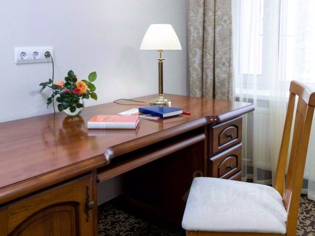 Комната: 2-спальная кровать (160 см), прикроватные тумбы, рабочий стол, стул, диван, журнальный стол, холодильник.