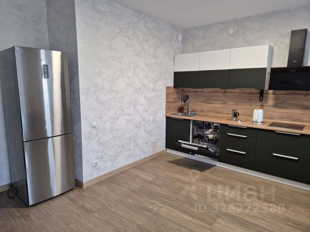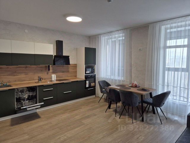 - стильная кухня оснащена индукционной плитой, духовым шкафом, СВЧ, вытяжкой и вместительным холодильником, а таже есть стол с 4мя стульями.